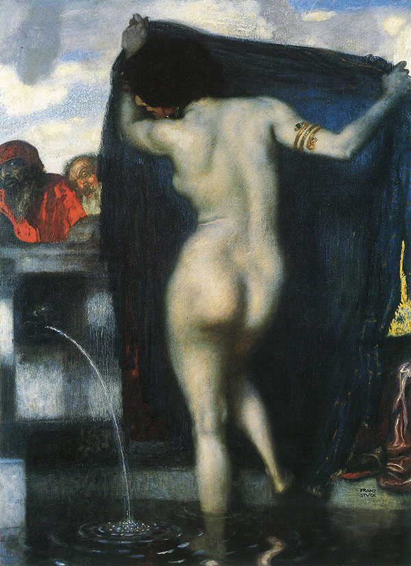 Stuck geht einen neuen Weg. Seine Susanna spielt ein Versteckspiel mit den beiden alten Richtern, die vergeblich versuchen, einen Blick auf die Nackte zu werfen. Wie schon im Gemälde «Kampf ums Weib» überträgt der Künstler die Macht auf die Frau. Keine Spur von erschreckt oder verängstigt.