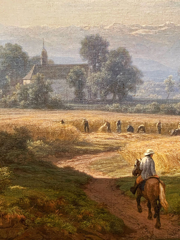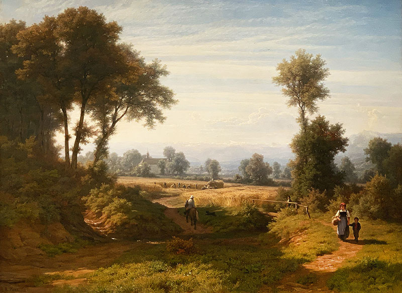 Zünds Gemälde ist im Stil «Lorrain» aufgbaut. Eine mächtige dunkle Baumgruppe zwingt das Auge, das Bild von links nach rechts zu lesen, wo eine idealisierte Realität abgebildet wird, die «heile Welt im gesegneten Land»: Die Kapelle, Menschen an der Arbeit, der reitende Vater, der auf Frau und Kind zurückblickt.