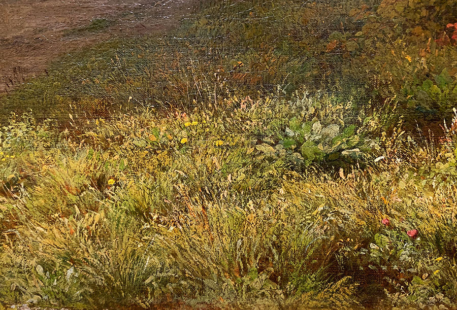 Maltechnisch bemerkenswert ist, wie Zünd die Wiese verarbeitet. Auf den ersten Blick scheint er jeden einzelnen Grashalm abzubilden, aber tatsächlich – und erst in der Vergrösserung zu erkennen – malt er die Wiese grob und vermittelt die Illusion einer detailgenauen Abbildung, indem er geschickt Farbtupfer am richtigen Ort setzt.