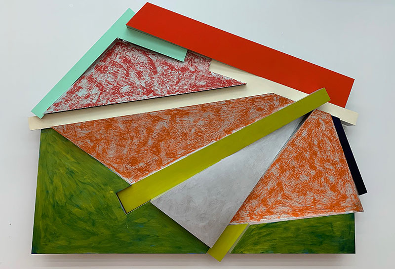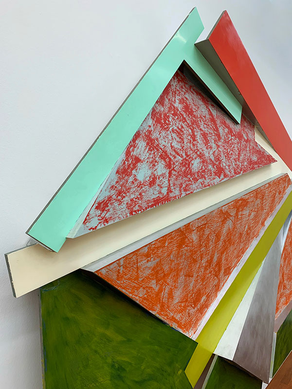 Es ist eine neue Art von Gemälde ohne Rahmen, nicht mehr flach, sondern in «2.7-D» (heisst: nicht mehr zweidimensional, aber auch noch nicht 3D). Das vorgestellte Werk aus Aluminium ist geschraubt und geschweisst und besteht aus mehreren Farbflächen (Farbfeldmalerei) in Lack und Öl, die teils lasierend, teils mit Bürste bearbeitet sind – aber auf jeden Fall schnell und maschinell aufgetragen – und damit wie gewünscht weit weg von der «europäischen Feinmalerei» mit Dachshaarpinseln.