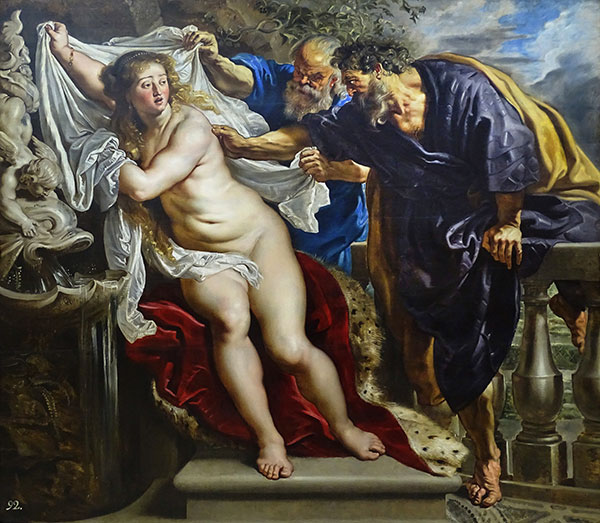 Es geht um eine berühmte Geschichte in der Bibel: Die fromme Susanna wird von zwei alten Richtern bedrängt, während sie badet. Die beiden Alten wollen sie gefügig machen, indem sie ihr drohen, sie des Ehebruchs zu bezichtigen, was die Todesstrafe nach sich ziehen würde.