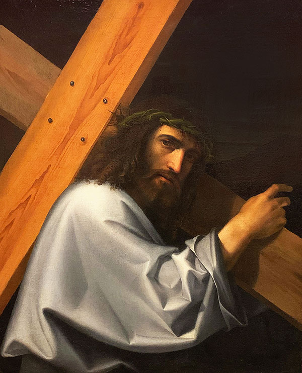 angewandt. Nicht nur das Gesicht des kreuztragenden Christus erscheint scharf abgebildet, sondern auch alle Details im Gemälde wie zum Beispiel der Holzbalken oder das Hemd mit seinen Falten. Hier basiert das Gemälde auf einer Zeichnung, die dann gewissermassen «ausgemalt» wurde. Mit Schatten und Lichtern erzielte der Künstler die natürliche Wirkung und eine Dreidimensionalität – besonders gut zu erkennen an den Falten im Hemd. Betrachtet man hingegen die Hand, so wirkt diese eher flach und wie eine Babyhaut. Wieso dies? Nicht auszuschliessen ist, dass der Meister die Hand gar nicht selber gemalt hat, sondern dass diese von einem Werkstattmitarbeiter ausgeführt wurde.