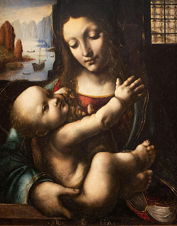 Napoletano war ein Schüler von Leonardo da Vinci. Da Vinci repräsentiert den Malertypus des ausgeprägten Naturalismus und die lineare Malerei, die später zur Grundlage der akademischen Malerei wurde. Mit seiner berühmten «sfumato»-Technik schaffte er es, an sich naturalistischen Bildern eine poetische Note zu verleihen. Wie machte er das? Er arbeitete zwar zunächst mit harten Linien, fügte diesen dann aber nach aussen einen weichen Übergang an und liess so das Bild soft, leicht verschwommen, erscheinen. Dieses Prinzip wandte auch sein Schüler Napoletano in seinem Madonnenbild mit Kind an, die beide ganz weich erscheinen.