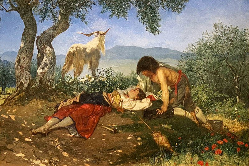 Das heute besprochene Gemälde von Frank Buchser «Der Kuss» aus dem Jahr 1878-79 ist eine Pastorale. So nennt man idyllische Hirten- und Schäferszenen, die eine Leichtigkeit des Seins vortäuschen, die es in der Realität allerdings nicht gibt. Man beschwört die «Freiheit der Hirten» und setzt sie an Sehnsuchtsorte, gewissermassen in den «Garten Eden».