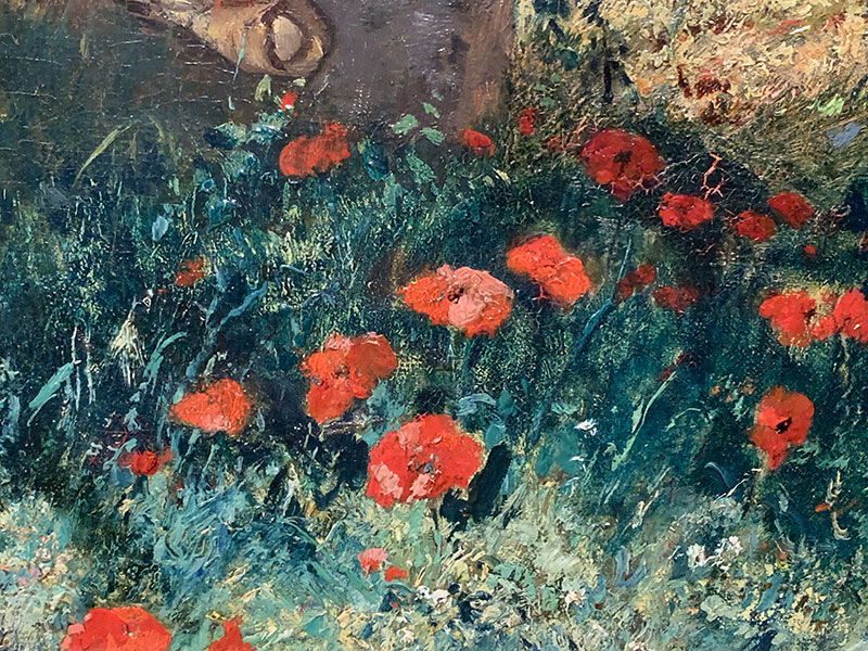Ganz im Gegensatz zum dritten Gemälde, In der Gartenlaube, das um 1891 entstand. Dieses zeigt ein altes Paar im Herbst des Lebens. Der greise Mann scheint eingeschlafen zu sein, und die Frau hält seine Hand. Beide Figuren sind fein ausgearbeitet, genial das Gesicht der Frau im Schatten und ihr akribisch detailliert gemaltes Kleid. Der Greis trägt einen schweren Morgenmantel mit Pelzbesatz und violette Schuhe. Der Kreis zu seinen Füssen könnte als Symbol des Lebenszyklus interpretiert werden: Ständige saisonale Wiederholung und Vergänglichkeit der Zeit.