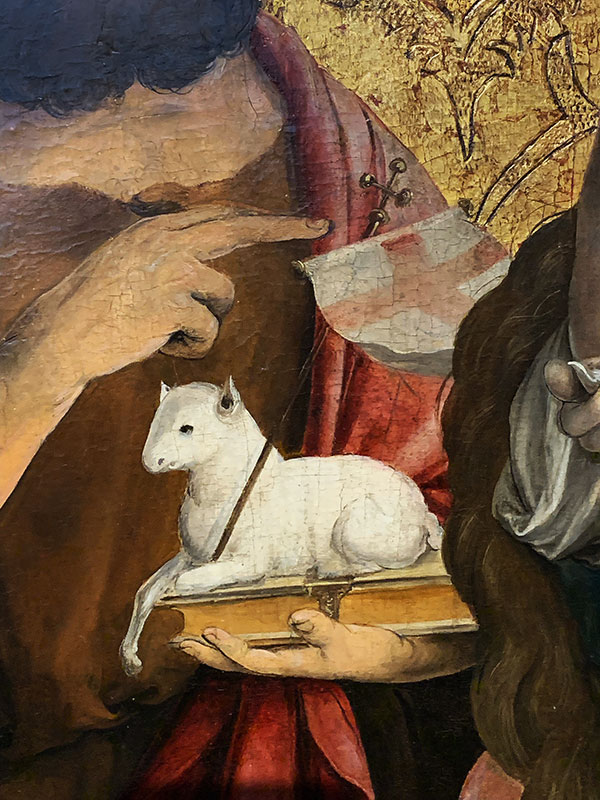 >Mehr über Johannes den Täufer. Dass es sich auf dem Bild um Johannes den Täufer handelt, belegt symbolisch das Schaf. «Seht, das Lamm Gottes» soll er gesagt haben, als er Jesus seinen Jüngern vorstellte. Jesus dagegen wird in der Kunst oft mit einem Vogel in Verbindung gebracht («Sie säen nicht, sie ernten nicht, und der himmlische Vater ernährt sie doch»).