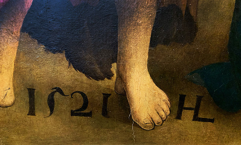 Dass dieses Spiel mit Schatten und Licht manchmal auch schief gehen kann, zeigt sich unter dem Hals des Heiligen: Hier setzte der Künstler auf eine flache Stelle des weissen Unterkleides eine Schlangenlinie, die einen Schattenwurf darstellen soll, wo es gar keinen geben darf. Auch hier steht die (reine) Vermutung im Raum, dass das nicht vom Meister stammen könnte, sondern von einem Gehilfen seiner Werkstatt.