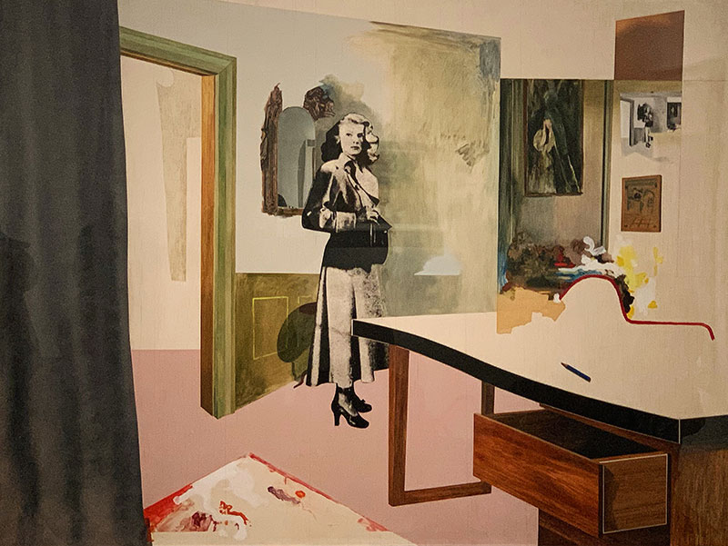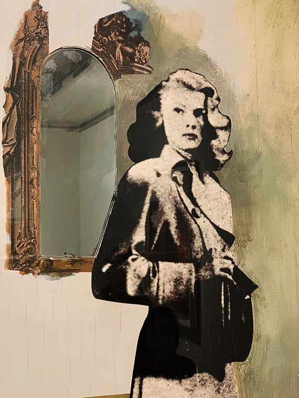 Das heute besprochene Werk ist eine Collage. Die Basis bildet ein Ölgemälde, das der Künstler mit zusätzlichen Elementen versah, so mit einer im Siebdruck hergestellten «Fotografie» der Schauspielerin Patricia Knight, die 1949 im Film «Shockproof» eine Hauptrolle hatte. Ein weiteres Collage-Element ist ein richtiger Spiegel als Bestandteil des Werkes.