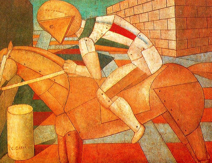 Carlo Carrà war ein italienischer Maler und Kunstschriftsteller. In seiner ersten Phase wandte er sich dem Futurismus zu. Dieser wurde 1909 durch den der Italiener Filippo Tommaso Marinetti gegründet. Dessen berühmtes futuristisches Manifest wurde auch von Carlo Carrà mitunterzeichnet. In diesem Manifest geht es ziemlich deftig zu. Der Verfasser besingt darin die «Liebe zur Gefahr», die Schönheit der neuen Geschwindigkeit und vor allem die Verherrlichung des Krieges – und die «Verachtung des Weibes».