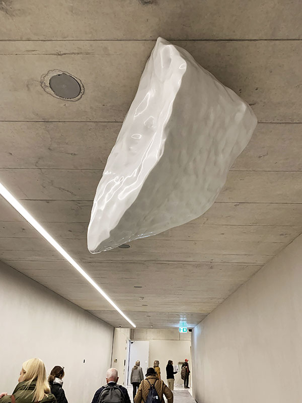 In der Passerelle drin stösst man dann auf Marmorbrocken an der Decke. Hier hat der isländische Superstar Olafur Eliasson, Jahrgang 1967, Hand angelegt. Was an der Decke hängt, sind Marmor-Nachbildungen von echten Eisblöcken, die von Gletschern abgebrochen (Klimawandel?) und an den Strand geschwemmt worden sind. Der Künstler hat sie an der Diamond Beach in Island gefunden, gescannt und nach den digitalen Daten Marmor-Kunstwerke geschaffen. Aus Carrara-Marmor.