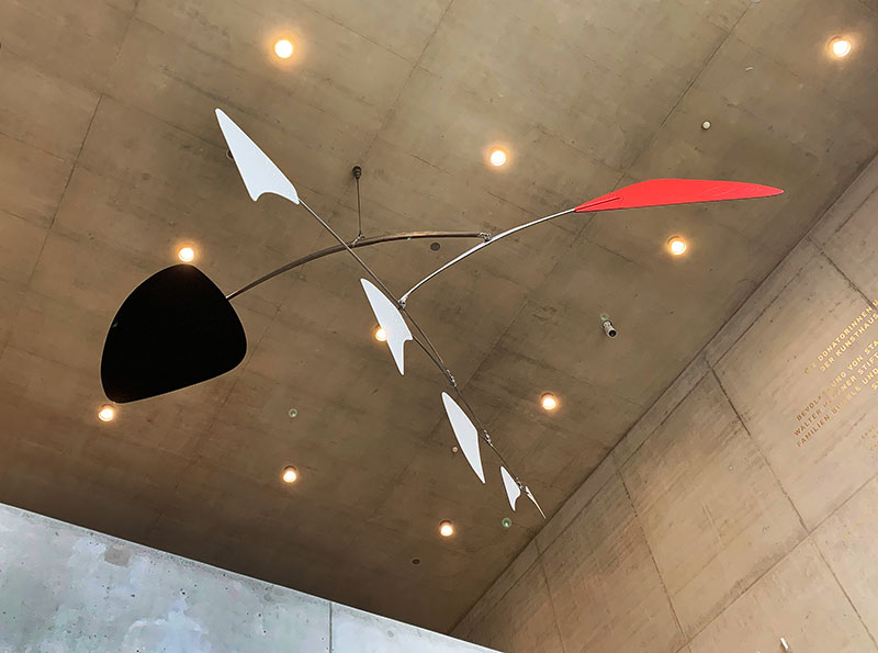 Zu den permanenten Kunstwerken im Chipperfield-Gebäude gehört ein grossformatiges Werk von Robert Delaunay (1885-1941), «Formes circulaires». Dann ein monumentales Mobile von Alexander Calder (1898-1976) mit dem Titel «Cinq blancs, un rouge» aus dem Jahr 1972, das wohl schon länger im Depot des Kunsthauses lagerte, aber im alten Haus zu wenig Raum fand. Jetzt hängt es prominent über der mächtigen Treppe zu den >Sammlungen im Chipperfield-Gebäude.