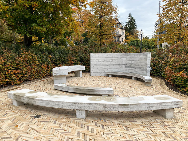 Ein Geschenk von Meister Chipperfield himself ist das Rondell im Garten an der Rückseite seines mächtigen Bauwerkes. Der Garten trägt den stolzen Namen «Skulpturenpark». Von Skulpturen ist im Moment allerdings nicht viel zu sehen, vielleicht kommen die ja noch. Im nächsten Sommer sollen dann auch noch Sonnenschirme zum Verweilen einladen, und eventuell auch Stühle oder Bänke? Im Moment ist Chipperfields Rondell (noch) die einzige Sitzgelegenheit.