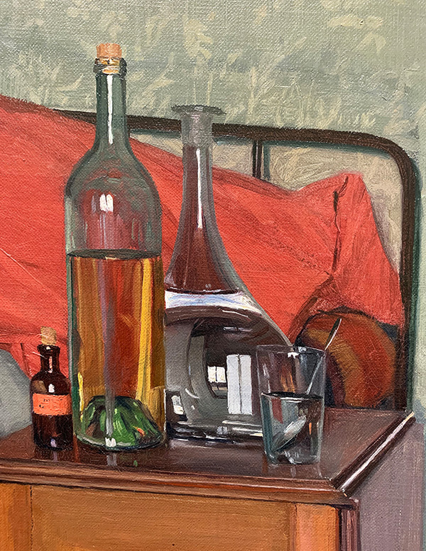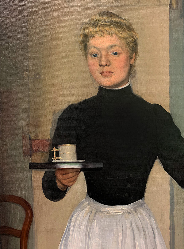 Auffallend an diesem Gemälde ist vor allem, dass keinerlei Beziehung zwischen den beiden Personen zu bestehen scheint. Die Kammerzofe, die der Kranken einen Tee bringt, schaut ins Leere. Zudem ist sie nicht in Bewegung, sondern posiert statisch – wie ein Modell. Überhaupt scheint die Komposition aus voneinander unabhängigen Einzelbildern zu bestehen, das gilt auch für die abgebildeten Möbelstücke (Stuhl, Tisch mit den Flaschen).
