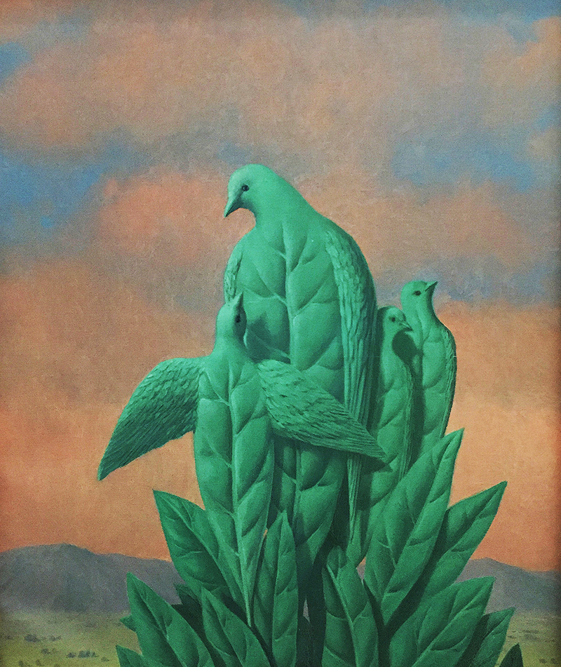 Und was ist mit den Grâces naturelles? Zunächst erkennt man Pflanzen, die nach oben wachsen möchten, so hoch wie möglich. Bis in den Himmel. In die Freiheit, so wie dies die Vögel können. Also verwandeln sich die Pflanzen in Vögel. Aber jetzt, wo diese auch zu Pflanzen geworden sind, verlieren sie die Möglichkeit, in die Freiheit zu entfliegen. Auch hier das gleiche Muster wie beim Apfel. Man fühlt sich verunsichert, weil die Geschichte nicht rational erklärbar ist. >mehr über René Magritte