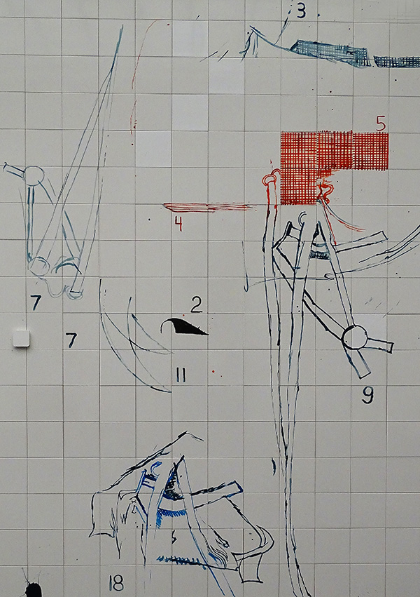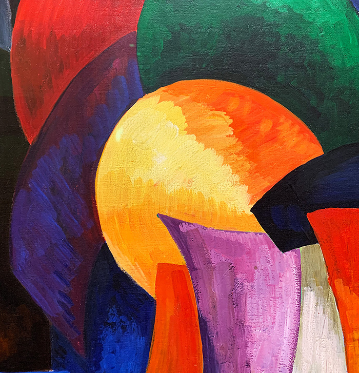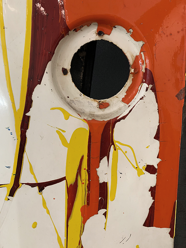 Die Blechteile rechts davon sind alle bearbeitet, zum Teil gepresst, gefalzt oder geformt. Die Bemalung der beiden Mittelteile ist freundlich-verspielt in leuchtenden Rot- und Gelbtönen gehalten. Der Teil rechts aussen dagegen in den dunklen, schweren Farben Ocker, Bordeaux und Blau. Am unteren Teil dieses «Armes» befindet sich ein flachgewalztes Blechstück in kräftigem Blau, gewissermassen als Abschluss.