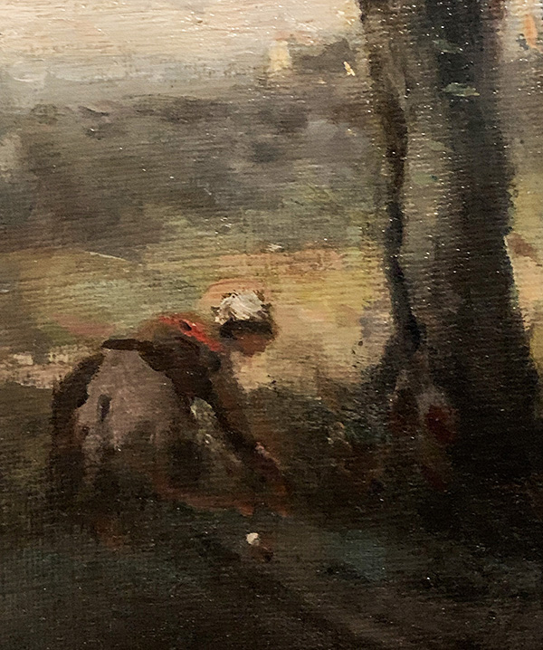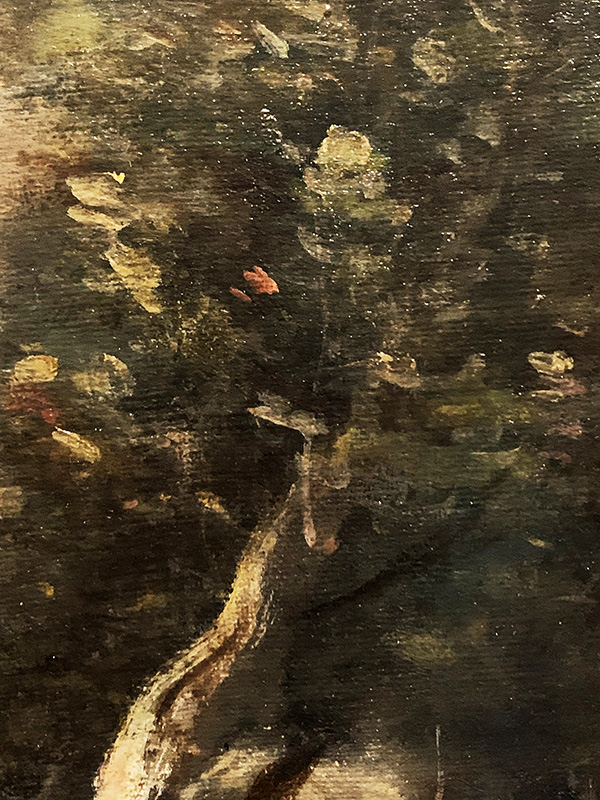 Wenn man die Details im dunklen Bereich der Bäume rechts oben im Bild (siehe Detail 2) betrachtet, dann sind dort tatsächlich keine fein ausgestalteten Blätter zu erkennen, wie man sie vom Realismus her kennt, sondern nur fleckenhaft aufgetragene helle Farbpunkte, mit der der Künstler den Eindruck von Blättern erzielt. Angedeuteter Impressionismus.