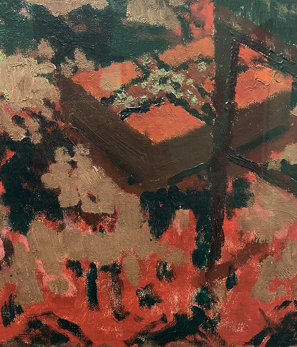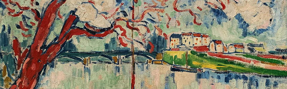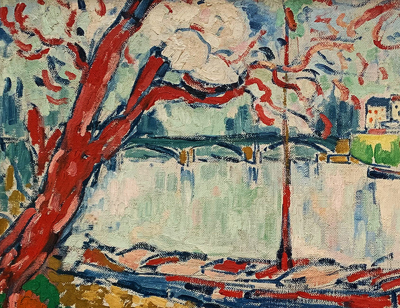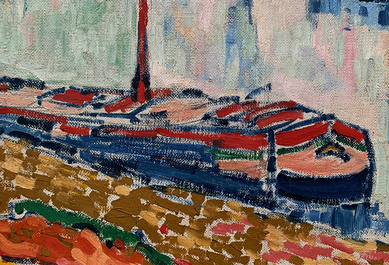 Fauvistisch kommen indessen die einzelnen Bildelemente daher: Der rote Baum links hat mit der Natur nichts gemeinsam, zudem scheint er in Einzelteile aufgelöst zu sein – die Äste sind zu einfachen Strichen reduziert. Auch der Lastkahn ist aus der Nähe betrachtet «nur» eine Kompilation von Farbflächen – aus der Distanz gesehen erwacht er aber zum Leben.