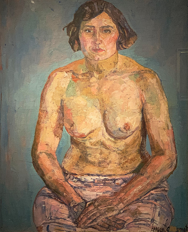 Auch im Gemälde «Nu» von 1923 arbeitet Alberto Giacometti mit «taches», sehr gut zu erkennen im Oberkörper. Auch hier sind Konturen zu sehen, vor allem an den Armen. Durch diese Konturen erscheint das Bild schärfer und besser «lesbar».