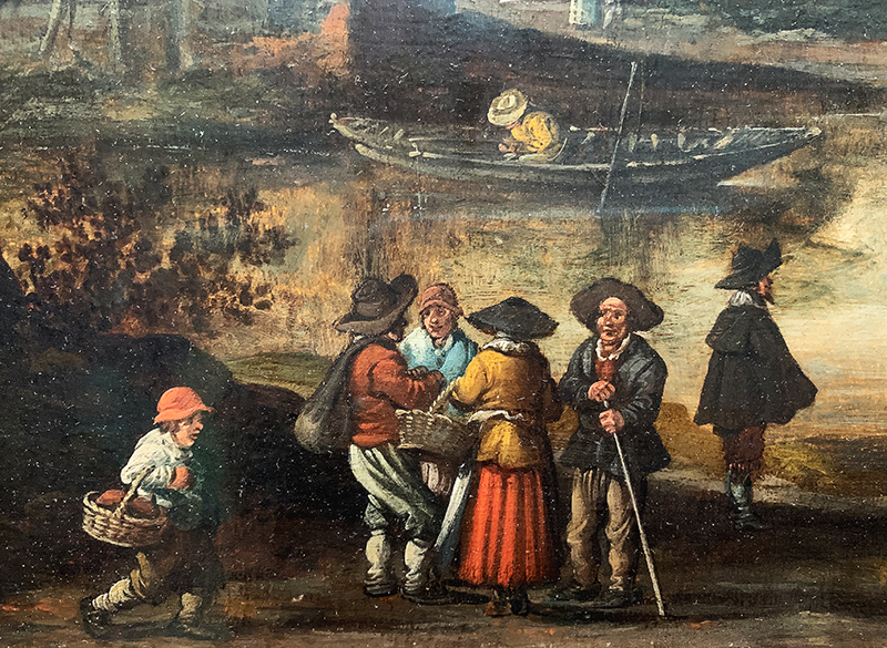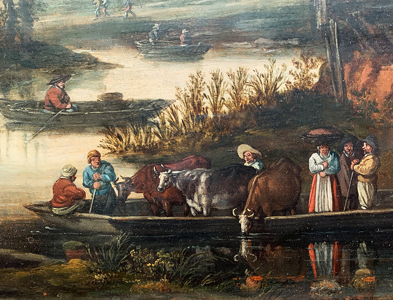 Das Gemälde wirkt sehr dunkel. Ob es bei seiner Entstehung auch so düster war, ist nicht klar. Die Farben könnten auch über die Jahrhunderte hinweg nachgedunkelt haben. Die Handlung im Bild: Die abgebildeten Bauern scheinen auf dem Weg zum Markt – oder zur Mühle – zu sein, denn sie sind alle schwer beladen, vielleicht mit Kornsäcken. Um zur Mühle zu kommen, müssen sie mit einem Kahn über den Fluss gelangen. Die Fähre scheint eine ziemlich robuste zu sein, trägt sie doch auch noch drei Kühe. Im Hintergrund links ist ein schlossähnliches Gebäude zu erkennen. Dieses wirkt abgehoben und isoliert von den einfachen Bauern im Vordergrund. Um die «Distanz» zu den Normalbürgern noch weiter zu betonen, malt der Künstler ein vornehm gekleidetes Paar vor dem Schloss.