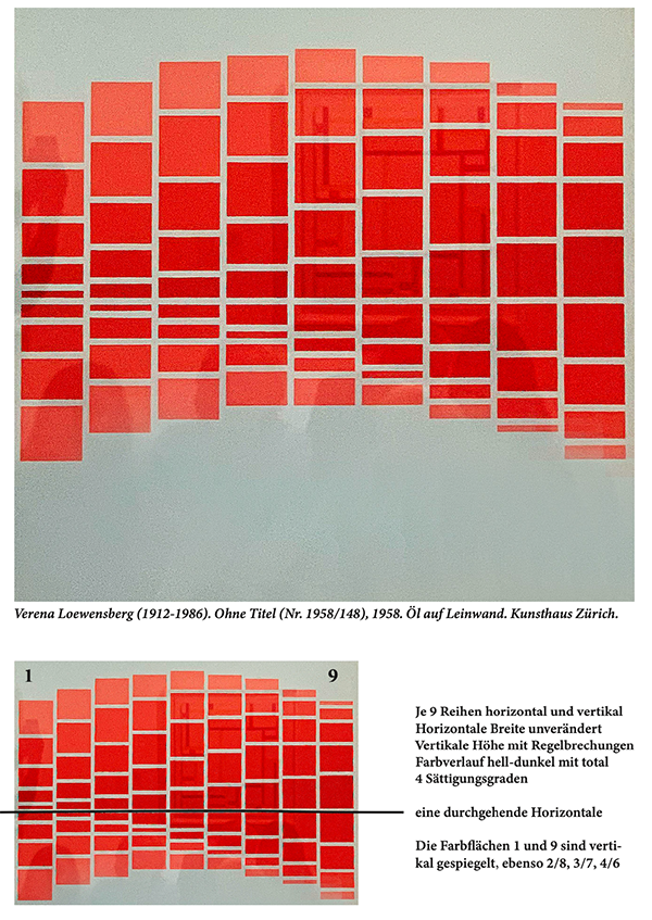Das besprochene Ölgemälde auf Leinwand von Verena Loewensberg zeigt Farbflächen in vier Sättigungsstufen. Die Farbflächen sind in je neun Reihen horizontal und vertikal angeordnet. In der Breite sind alle Flächen gleich, in der Höhe aber unterschiedlich. An diesem Punkt kommt die künstlerische Freiheit zum Tragen. Es geht darum, durch Regelbrüche Spannung ins Werk zu bringen – das Auge der Betrachter:innen soll beschäftig werden. Loewensberg hat ihre Regelbrüche sehr subtil eingeflochten und zwar unter der Horizontallinie, wo einzelne Farbflächen nicht in jener Höhe abgebildet werden, die eigentlich der Regel entsprechen würden.