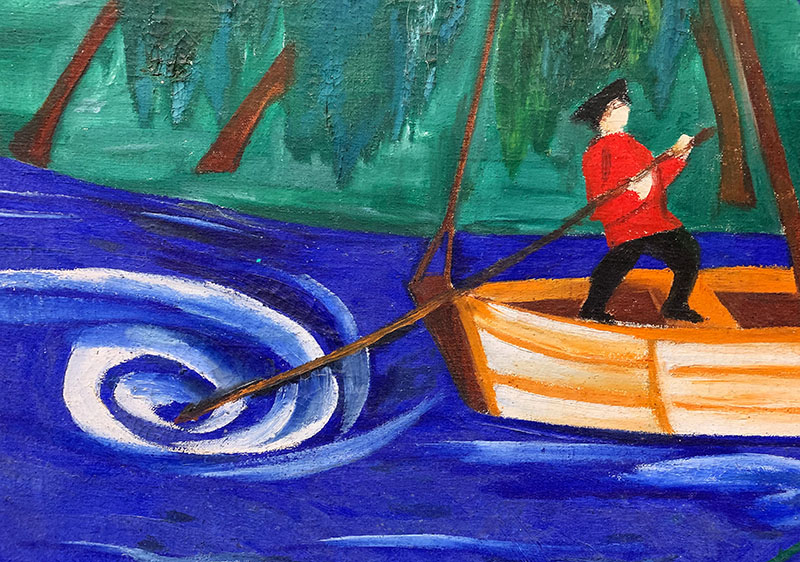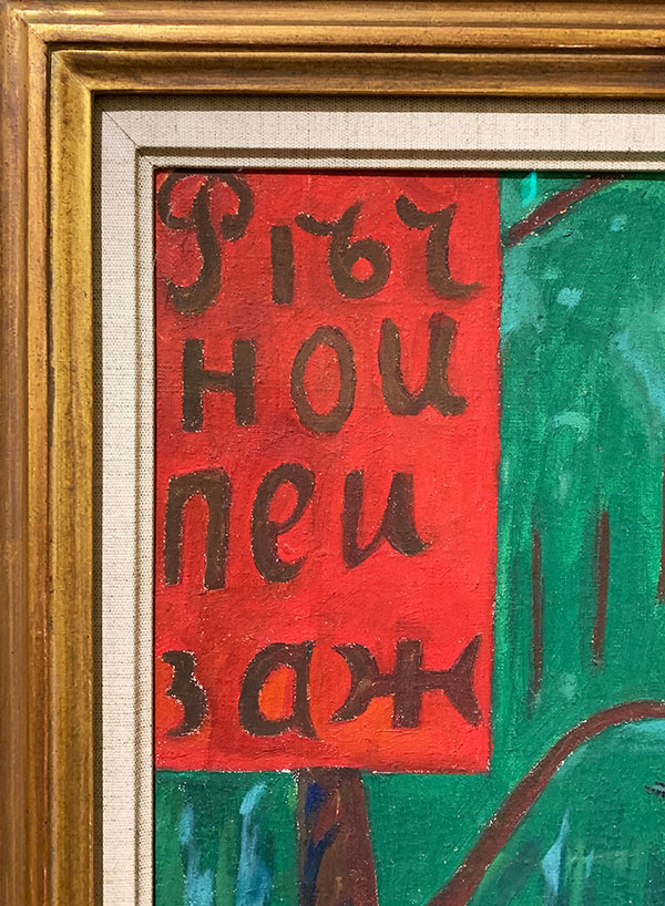 Ziemlich aussergewöhnlich ist der Schriftzug auf dem Gemälde in der Ecke oben links. Damit kein Zweifel aufkommt, was auf diesem Werk zu sehen ist, schreibt es die Künstlerin mit grossen kyrillischen Buchstaben an: речной пейзаж. Und was heisst das? Ganz einfach – Flusslandschaft.