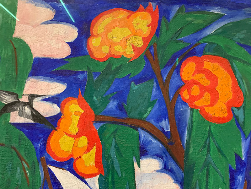 Blumen spielen in der Kunst von Natalja Gontscharowa eine wichtige Rolle. Auch in diesem Werk setzt sie Blumenmuster sehr farbig und plakativ ein, hier wachsen sie sogar an einem Baum. Die Farbigkeit des Gemäldes ist überwältigend. Im dunkelblauen Himmel sind rosa Wolken zu erkennen, ein Märchen-Fantasievogel fliegt davor vorbei.