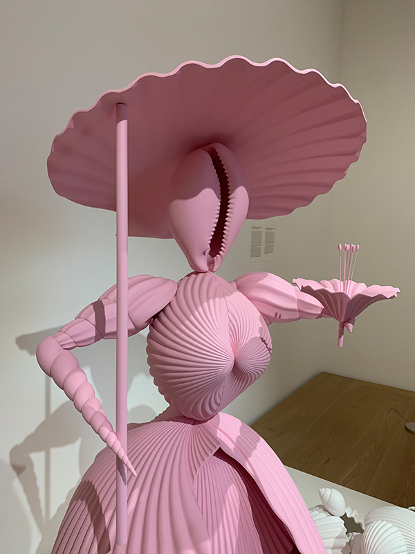 Die pinkfarbige Frau und den kleinen Hund verlegt Katharina Fritsch in die Zeit des >Rokoko und parodiert die damalige Mode mit den ausladenden Röcken, der Wespentaille, dem breitrandigen Hut und dem modischen Accessoire-Hündchen.