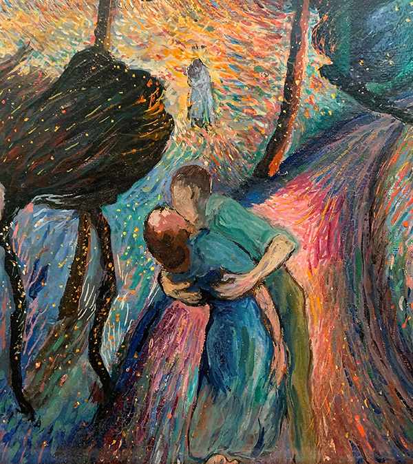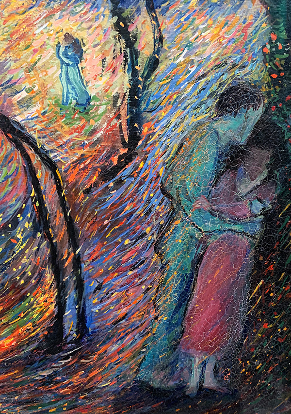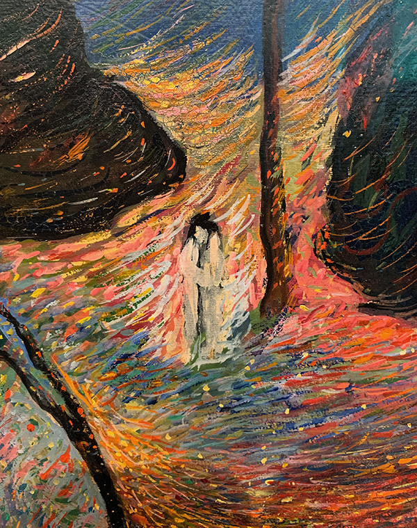 Das Liebespaar links unten verkörpert den Anfang der Beziehung. Es steht auf einer Strasse, die ins Ungewisse führt. Mit den Liebenden wird die Sturm-und-Drang-Phase versinnbildlicht, das erste Feuer, die Eroberung. Die beiden kleinen Paare im Mittelteil des Bildes drücken mit ihren ruhigen Umarmungen Harmonie aus. Das Paar rechts unten schliesslich steht für die Entzweiung, das Zerwürfnis – die Frau wendet sich ab. In der Mitte klein und verloren die einsame und verzweifelte Person (ist das wirklich eine >einsame Person?). Das Zentrum malt die Künstlerin mit sämtlichen verfügbaren Farben, wild, dramatisch, in feinen Pinselstrichen. Im Hintergrund schliesslich ein dunkler, drohender Berg – die düstere Zukunft. Die Gefühlslage der Künstlerin zu jener Zeit ist unschwer zu erraten.