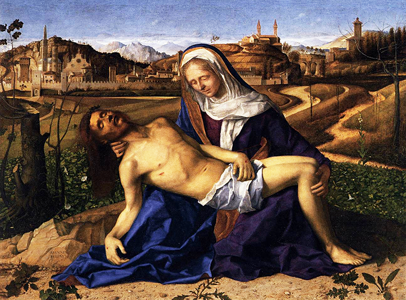 Als Gegenstück zu Provosts Beweinung zeigt die Referentin auch noch ein Gemälde von Giovanni Bellini aus dem Jahr 1505. In diesem wird eine «echte» Pietà dargestellt: Nur Maria mit ihrem toten Sohn. Bemerkenswert ist vor allem, wie naturgetreu Bellini den Körper Christi malt – im Gegensatz zu Provost, bei dem der Körper wie eine Puppe aussieht. Das könnte damit zu tun haben, dass Künstler in Italien um 1500 herum besseren Zugang zu sezierten Leichen und anatomischen Studien hatten als nördlich der Alpen.
