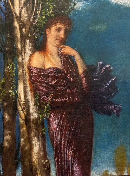 Das besprochene Bild «Frühlingserwachen» ist eine Art «Gegenmotiv» zu seinen Lieblingsthemen Tod und Vergänglichkeit. Es zeigt den Frühling als personifizierte junge Frauenfigur mit leicht transparentem Kleid in einer idealisierten Landschaft. Die drei anderen Figuren sind (von links) eine Frühlingshore, die Blumen streut; dann Pan, der Natur- und Hirtengott der griechischen Mythologie. Pan wird typischerweise als Mischwesen aus Mensch und Ziege mit Hörnern, Ziegenbeinen und oft einer Panflöte dargestellt. Er gilt als Symbol von Vitalität und Fruchtbarkeit. Das Wort panisch hängt mit Pan zusammen. In der Antike erzählte man sich, Pan könne durch sein plötzliches Erscheinen Herden und Menschen in einen «panischen Schrecken» versetzen. Die Frau rechts aussen wird mit der Hand am Kinn dargestellt – die kunsttypische Haltung für den «Denker» von >Auguste Rodin, hier als Denkerin.