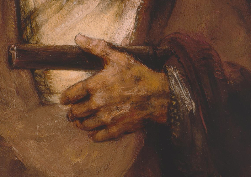 Ein ähnliches Bild ergibt sich bei den Händen. Auch diese sind nicht gezeichnet und im Detail ausgeführt, vielmehr stellt der Künstler die gealterte Haut durch zahllose Farbschichten so dar, dass die Hand zu leben beginnt. Den gleichen Effekt erzielt er auch im Gesicht des Apostels. Hier gelingt es Rembrandt, die Haut mit Farbschichten so darzustellen, dass man gewissermassen in seine Seele blicken kann.