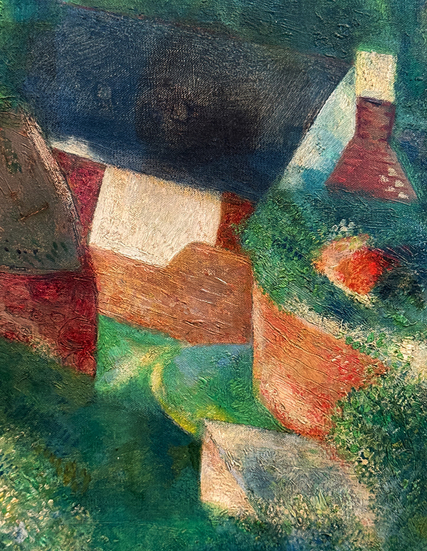 Das Gemälde setzt sich aus mehreren Malstilen zusammen. Es handelt sich um ein Ölgemälde, aber die Fensterflächen mit ihren Spiegelungen wirken wie ein Aquarell. Im Prinzip ist es ein realistisches Landschaftsbild; die Wiese im Vordergrund enthält pointillistische Elemente, einige Häuser sind dagegen kubistisch aufgebaut – in Anlehnung an Chagalls kubistische Phase um 1912 herum, als sein «Selfie mit den sieben Fingern» und dem kubistischen Kopf und Körper entstand >mehr |