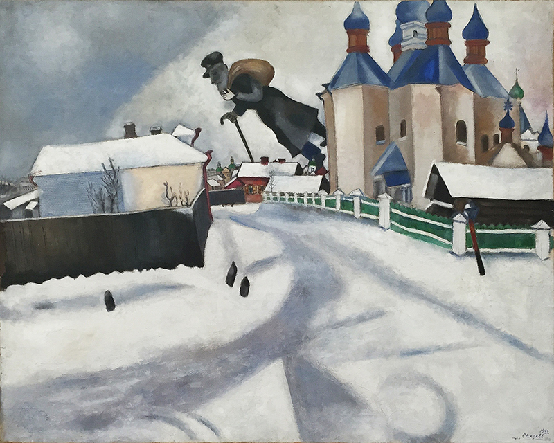 1913 stellt er in Berlin aus, reist dann 1914 zur Hochzeit seiner Schwester nach Witebsk. Dann bricht der Erste Weltkrieg aus und Chagall kann nicht mehr zurück. In Witebsk erlebt er, wie die Stadt zum Zufluchtsort für Tausende aus der Grenzregion ausgewiesene Juden wird. Die im Bild «Au-dessus de Witebsk» «fliegende» Figur könnte einen dieser ausgewiesenen Juden darstellen. Die Russische Revolution von 1918 erlebt Chagall in Witebsk. Er wird «Kommissar der bildenden Künste» und gründet in Witebsk eine Schule für moderne Kunst.