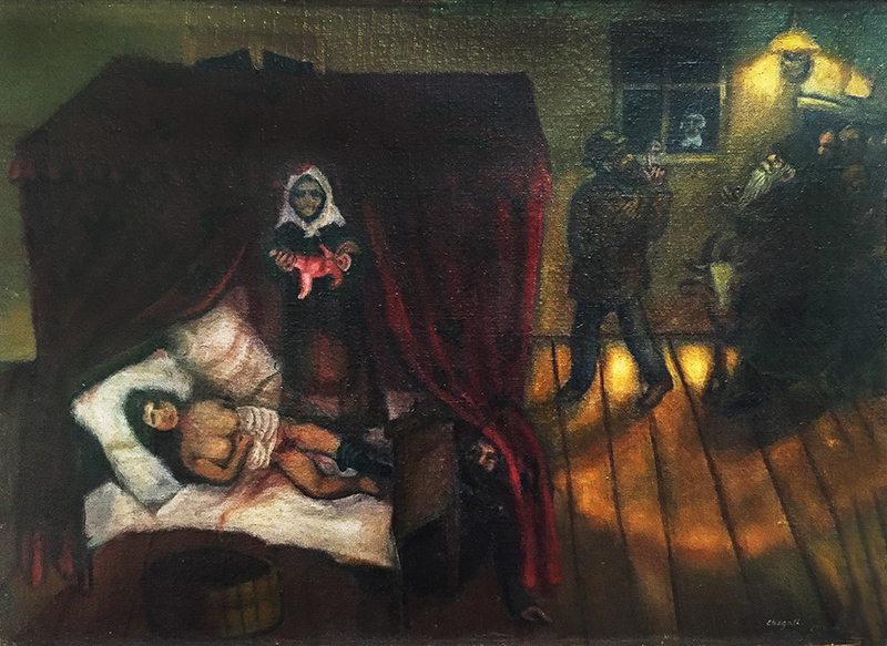Nicht immer malte Chagall solche leichten Frühlingsbilder wie das «Fenster zur Insel Bréhat». In seinen Frühwerken dominierten vielmehr dunkle Töne. Ein Beispiel dafür ist «Die Geburt» von 1910. Die Szene spielt in einem chassidisch-orthodoxen Milieu, das Chagall noch aus seiner Kindheit kennt. Es ist aber keine religiöse Darstellung, sondern eine ziemlich real gemalte Geburt von Chagalls jüngstem Bruder. Der Säugling noch voller Blut, ebenso die Mutter. Die Szene wird von zahlreichen «Gästen» beobachtet, einer schaut sogar durchs Fenster. Und obwohl in jener Zeit eine Geburt noch reine «Frauensache» war, lässt Chagall den Vater im Bild erscheinen, dieser versteckt sich hinter dem Vorhang am Fuss des Bettes und verfolgt von dort die Geburt. Kurz nach der Erschaffung dieses Werkes zieht Chagall nach Paris. Ab 1911 entstehen dort viele seiner berühmten «Heimwehbilder» mit Kühen und ländlichen Motiven.