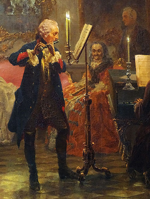 Friedrich II der Grosse Erbauer von Schloss Sanssouci. König von Preussen von 1740 bis 1786. Kriegsherr, Literat, Denker und Musiker. Von seiner Flötenkunst war er so besessen, dass er sogar im Feld zwischen den Schlachten Privatkonzerte gegeben haben soll.
