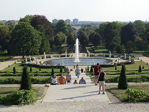 Direkt unter dem Schloss liess Friedrich II einen terrassierten Weinberg anlegen, an dessen unterem Ende die grosse Fontäne und das Brunnenbecken für königliche Stimmung sorgen.