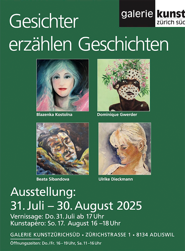 Bis 30. August 2025 Gesichter erzählen Geschichten Die Ausstellung in der Galerie Kunst-Zürich-Süd in Adliswil zeigt vom 31. Juli bis 30. August vier Künstlerinnen des gleichnamigen Vereins: Ulrike Dieckmann, Dominique Gwerder, Blazenka Kostolna und Beata Sibandova. |