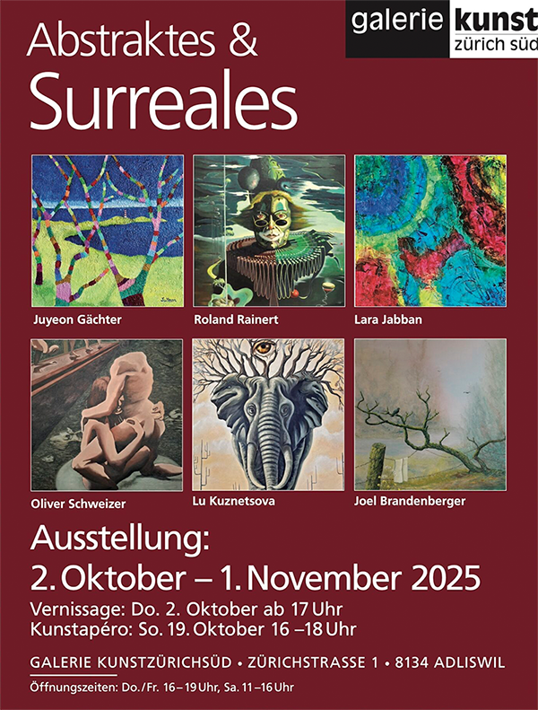 Bis 1.11.2025 Abstraktes & Surreales Sechs Künstlerinnen – alles Mitglieder des Kunstvereins Kunst-Zürich-Süd Adliswil – befassen sich mit diesen zwei Themen. |