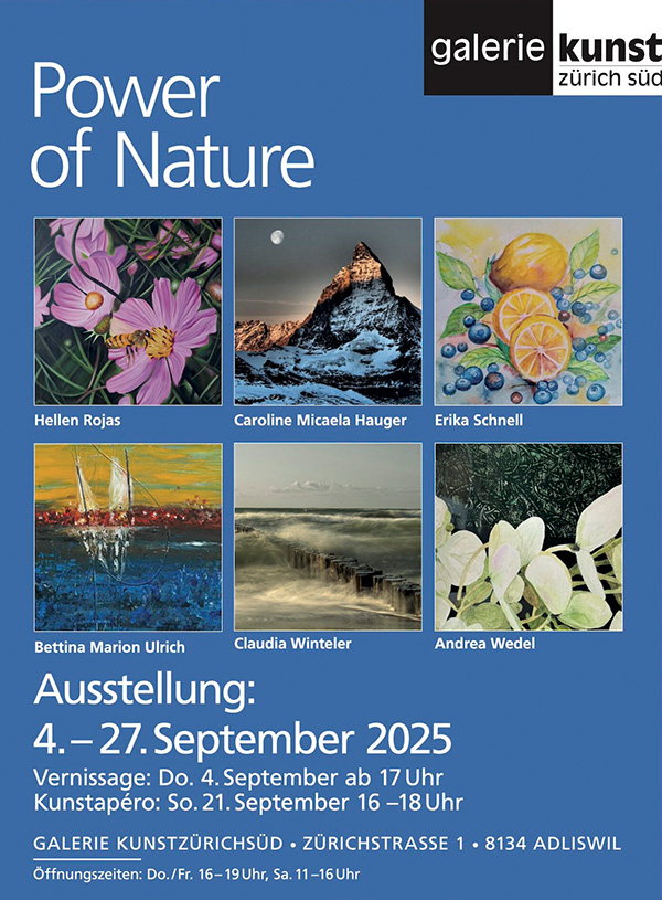 Bis 27.9. 2025 Power of Nature Sechs Künstlerinnen – alles Mitglieder des Kunstvereins Kunst-Zürich-Süd Adliswil – befassen sich mit diesem Thema und zeigen die schönsten Seiten der Natur – in Fotografien, in Öl, Acryl, Aquarell und Pastellfarben. |