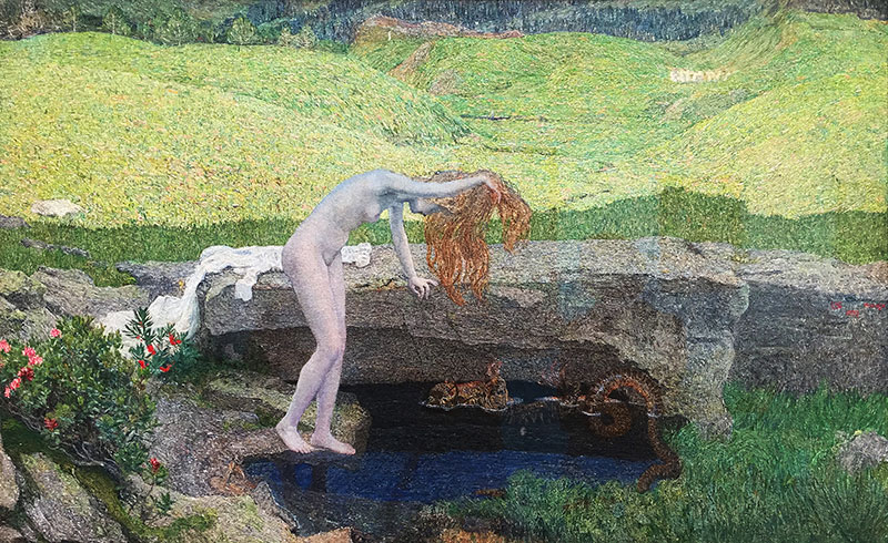 In diesem Gemälde – das im Oberengadin entsteht – verarbeitet der Künstler ein Thema aus der griechischen Mythologie: Narziss, der sich in sein eigenes Spiegelbild verliebt. Segantini bildet allerdings eine junge Frau mit roten Haaren ab, die sich im «Spiegel» anschaut. Und im Wasser wartet ein symbolträchtiges Schlangengetier.
