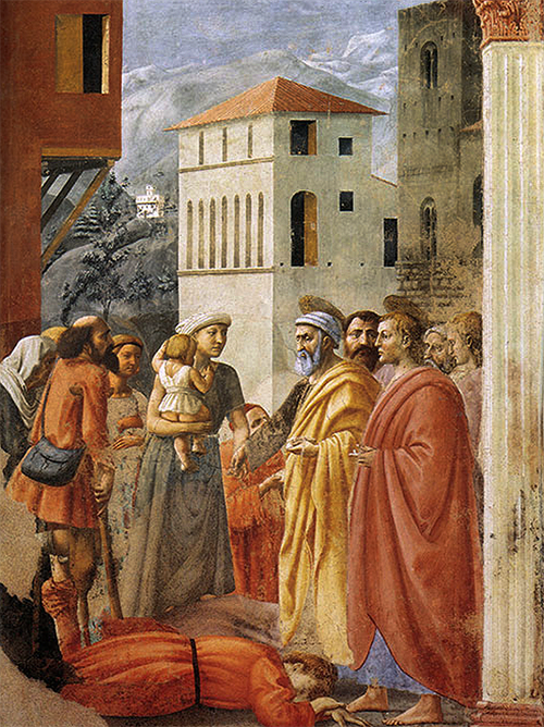 Masaccio (1401-1428). Die gerechte Verteilung der Güter. Brancacci-Kapelle in der Kirche Santa Maria del Carmine, Florenz.