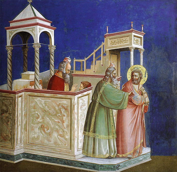Giotto di Bondone (1266-1337). Vertreibung des Joachim aus dem Tempel, Scrovegni-Kapelle von Padua, 1303.
