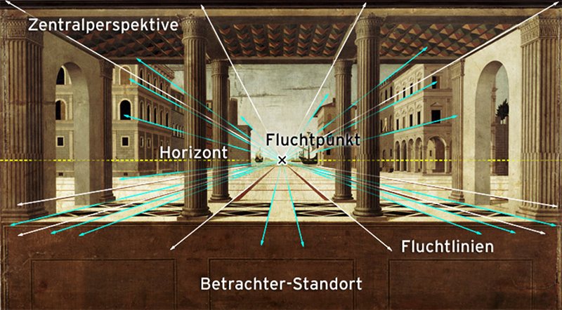Hier setzt die Zentralperspektive an. Sie imitiert das Sehvermögen des menschlichen Auges und stellt den Raum so dar, wie wir ihn erkennen: Was nahe beim Auge ist, erscheint gross – je weiter entfernt etwas ist, desto kleiner erscheint es, egal wie gross der Gegenstand oder die Figur in Wirklichkeit ist.